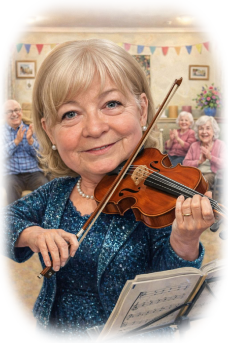 Alison can play violin and adapt to residents singing and engaging them with classical, traditional or popular violin pieces and even play along with songs from Alison and Mark's repertoire.